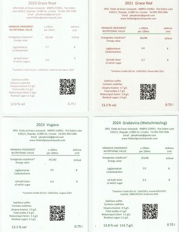 For 2026 we will offer The Grace Blend (Merlot/Cabernet Sauvignon), Vugava, Grace Rosé (Cabernet Sauvignon), Welschriesling (also known as Graševina), and Mostosa (also known as Kuc and Trbljan). Price per bottle will range from 12 euro for Vugava and Mostosa, to 14 euro for Grace Rosé and The Grace Blend
